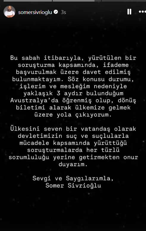 Ünlülere yönelik yasaklı madde operasyonunda aralarında şef Somer Sivrioğlu’nun da yer aldığı 14 kişi hakkında gözaltı kararı verilmişti. Somer Sivrioğlu yurt dışında olduğunu belirten bir açıklama yaptı. Ünlü Şef Sivrioğlu iş nedeniyle Avustralya’da olduğunu belirtirken dönüş biletini aldığını da duyurdu.